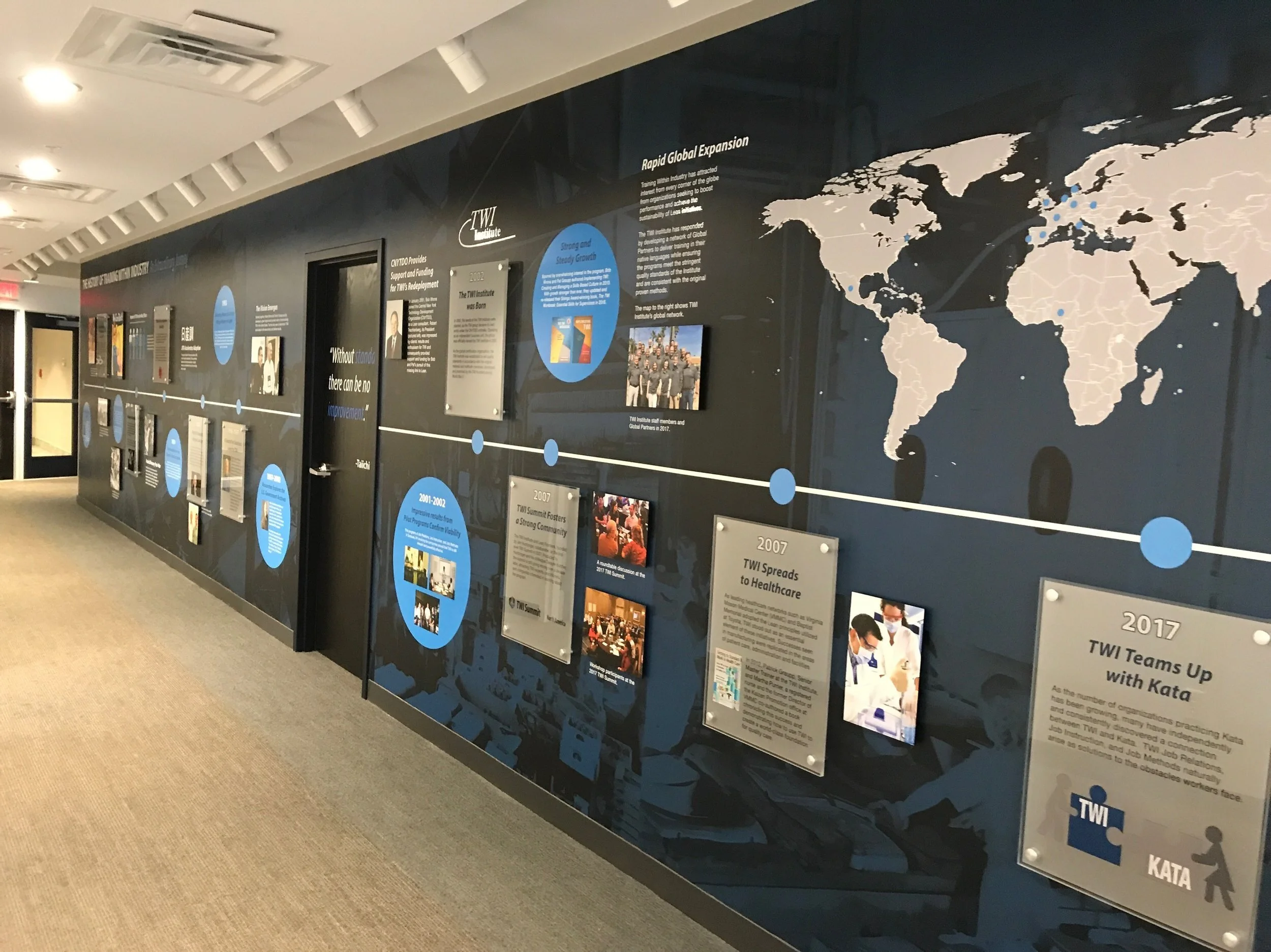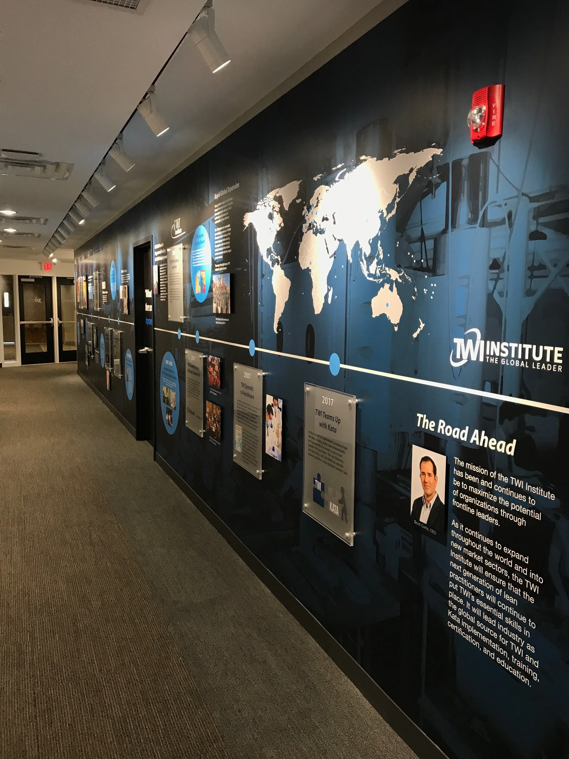 I was asked to design a 40 foot long mural for TWI Institute in order to showcase the timeline and history of the company, which began back in World War II. Working closely with the marketing director and the printer, I was able to incorporate a vinyl background, raised plaques and images, as well as 3D lettering.